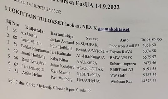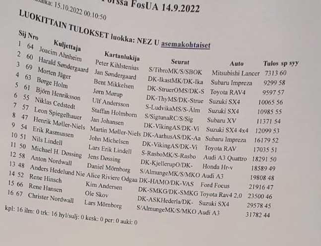NEZ OnLineTäsmäsää Forssa, Lammi Lähtöluettelot (pdf): perjantai/Forssa . lauantai/Lammi Ohrakierre 2022 Facebook Kalen kierroksen Tulokset ja AT-erittely Lammin Ohrakierteen tulokset Sarjapisteet 2022-10-16 @1:42 (EET) Suomen NEZ-viikonloppu on taputeltuKisat ovat onnellisesti (kenelle enemmän, kenelle vähemmän) ohi, tulokset on ripustettu nettiin ja sarjapisteet on päivitetty. Show jatkuu Ruotsissa noin 310 tunnin päästä...2022-10-15 @20:45 (EET) Tuloksia lauantailtaKisa oli aivan toisenlainen kuin perjantain kapina. Etenevää ja vauhdikasta pyöritystä. Tarkkoja asemia oli tässäkin kisassa paljon, niin kuin arvokisassa kuuluukin.NEZ-kotimaiset1. Uotila - Åstrand 2465 2. Ojanperä - Mamia 2895 3. Viitala - Heikkilä 3155 4. Hämäläinen - Kulmala 3170 5. Lundahl - Bitter 4171 6. Tuomala - Tuomala 5086 7. Kotajärvi - Kotajärvi 6604 8. Heino - Winberg 9248 2022-10-15 @10:53 (EET) Sarjapisteet päivitettyTuttuja nimiä siellä on kärkiporukassa ja maajoukkuepisteet menivät aika tasan Tanskan ja Ruotsin kesken. Meikäläisittäin olisi "ihan kiva", että ruotsalaiset ottaisivat tänään vaikkapa kolmoisvoiton...2022-10-15 @1:30 (EET), tuloskuvat @1:45 (EET) Forssan NEZ-osakilpailun jälkitunnelmiaOlipas haasteellinen kapina! Kolme tiukkaa pyöritystä viistonnisilla kartoilla ja pari etenevää jaksoa enemmän tai vähemmän pelkistetyillä kartoilla. Kilpiä jäi pois oikein urakalla ja aikaa paloi.Tarkimmin ratamestarin koukerot selvitti Viitala-Heikkilä mutta aikapisteet pudottivat parin kakkospaikalle. Täydet NEZ-pinnat kotimaisten luokassa kuittasi Uotila-Åstrand ja kolmanneksi suoritui Kaipainen-Kulmala. Ulkomaalaisten luokassa ylivoimaisesti tarkimmin - ja toiseksi nopeimmin - ajoi Ruotsin Ahnheim-Kihlstenius, tuloksena ylivoimainen luokkavoitto. Kolme seuraavaa sijaa menikin sitten tanskalaisille: Söndergaardit, Jäger-Mikkelsen ja Holm-Mörup. Tulokset ja sarjapisteet päivitän "hyvin nukutun yön jälkeen"... pistän tähän kuitenkin paikalle jääneen papparassin nappaamat kuvat tulosluetteloista. ![]() ![]() 2022-10-14 @11:15 (EET) Forssan NEZ-osakilpailun spekulointiaTänä iltana jatkuu pitkän kesätauon jälkeen autosuunnistuksen NEZ-sarja Forssassa. Kilpailu on Forssassa pari kymmentä vuotta vaikuttaneen AS-puuhamiehen Kalevi Kaijan muistoajo mutta toinenkin kova menetys järjestäjäpuolella tapahtui seuran aktiivisen puuhamiehen Kari Hintikan menehtyessä viime joulukuussa.Seuran surullisesta lähihistoriasta huolimatta ratamestari Joni Halmelta on lupa odottaa vaativia koukeroita, jotka varmasti erottelevat jyvät akanoista. Kansallinen C-luokka avaa pelin vielä päivänvalon aikaan klo 17:30, sen jälkeen B-cup käy raapimassa radalle omat kuvionsa ennen kuin kansallinen MA-luokka starttaa ja lopulta klo 19:28 on pääluokan eli NEZ:n vuoro. Viimeinen osallistuja lähtee reitille klo 20:12. Kisan kesto on kutsun mukaan noin kaksi ja puoli tuntia, eli sikäli kun vanhat merkit pitävät paikkansa, ensimmäinen NEZ-sarjalainen saapuu maaliin noin klo 22 ja viimeinen sitten joskus aamuyöstä. Mukana ovat kaikki sarjan kärkipaikoilla nyt olevat konkarit ja muutama "yllätysnimikin". NEZ-sarjassa jokainen osakilpailuvoitto ja sen tuoma 60 pistettä on selvä etulyöntiasema muihin nähden. Näitä arvokkaita luokkavoittoja napsivat Tanskassa Tomi Viitala - Juha Heikkilä, Jouni Heikkilä - Riku Bitter sekä Børge Holm - Jørn Mørup. Tanskassa useita voittoja takavuosina napsinut Ulf Andersson oli lainakuskin kanssa matkassa ja kahden kakkossijan myötä jakaa sarjan kärkipaikan tällä hetkellä Viitala-Heikkilän kanssa. Suomessa "Uffe" on myös pärjännyt hyvin ja nyt kuskina istuu "vakiokaveri" Björn Henriksson. Vaikka Uffella on viimeisen kymmenen vuoden ajalta vain kolme Suomen osakilpailuvoittoa on häneltä lupa odottaa hyviä esityksiä. Laittaisin kuitenkin omat roposeni ulkomaalaisten luokassa Søndergaardin veljesparille, seitsemän luokkavoittoa Suomesta, joista kaksi edellistä viime vuodelta... Muita "kovia luita" ovat Tanskan Spiegelhauer-Johansen, Holm-Mørup ja Jæger-Mikkelsen sekä Ruotsin Ahnheim-Kihlstenius. Mukava yllätys on nähdä mukana pitkän kilpailutauon pitänyt Alice Riviere, jonka sukunimeen on tullut lisää Odgaard. Hmm, Alice itse asiassa tekee debyyttinsä NEZ-sarjassa, hänen edelliset "edesottamukset" autosuunnistuksesta kotimaansa ulkopuolella ovat PM-sarjasta 19 vuoden takaa... Kotimaisista kovimpia lienevät Heikkilä-Bitter, Viitala-Heikkilä ja ... keikkakuskikseen kartturina ja tarkkuussuunnistajana paremmin tunnetun Ari Uotilan saanut Stefan Åstrand mutta eipä unohdeta muitakaan TOP 10:ssä tällä hetkellä olevia meikäläisiä: Kaipainen-Kulmala, Ojanperä-Mamia sekä Heino-Winberg. Tekniikkavarauksella paiskailen tänne terveisiä tuloslaskennasta yön pimeinä tunteina... 2022-10-10 @0:45 (EET) Ruotsin lauantaikisan kutsua on päivitettyEnpä yllättynyt kun sain luotettavalta taholta kuulla, että Ruotsin lauantaikisan kutsuun on tullut muutoksia. Ilmoittautumishärvelin ongelmista johtuen Beginner's Cup:iin osallistuvien tulee ilmoittaa asia sähköpostilla. Tämän lisäksi jotain ajoituksellisia asioita on päivitetty.Uusi kutsu on päivitetty kilpailut-sivulle, merkkasin siihen missä on muutoksia. Päivitä selaimen sivu jos sieltä tulee vanha... 2022-10-09 @15:31 (EET) & 20:25 (EET) Suomen NEZ-viikonloppuEnsi viikonloppuna kisataan Suomessa autosuunnistuksen NEZ-pisteistä (ja lauantaina myös SM-pisteistä). Perjantaikisan lähtöluettelo (pdf) on juuri lähtenyt jakeluun. Ja illansuussa totesin, että myös Lammin kisan lähtöluettelo (pdf) löytyi Kitistä. Ei siis tarvinnut yhtään kitistä... :)2022-09-15 @14:41 (EET) Ruotsin NEZ-osakilpailutRuotsinkin NEZ-viikonlopun kutsut ovat tulleet julki ja ilmoittautuminen alkanut. Linkit kisatietoihin, kutsuihin ja ilmoittautumisiin löytyvät kilpailut-sivulta2022-09-15 @14:11 (EET) Suomen vuoro isännöidä NEZ-osakilpailutSu