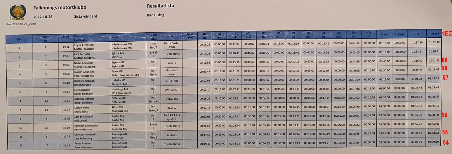NEZ OnLineRuotsin uudet säännöt Täsmäsää Falköping, Lilla Edet Kutsut (pdf): perjantai, lauantai Lähtölistat (pdf): perjantai, lauantai Tulokset (pdf): perjantai 2022-10-29 @21:50 (EET) päivitys 22:54 (EET) Ruotsin lauantaikisan kuulumisiaOli sitten pikkasen erilainen kapina...Jos perjantaikisassa kartat ja mittakaavat olivat "mitä sattuu", tänään oli kaikki viimeisen päälle kohdallaan. Tai... kyllähän näilläkin kartoilla virheitä tehtiin. Valitettavasti tanskalaiset vaikuttavat jälleen vahvoilta... Mestaruus näyttää jälleen napsahtavan Söndergaardeille ja maajoukkuekulta tanskalaisille. Ruotsalaisten tulokset: 1. Henriksson - Andersson 0:54:31 60 2. Ahnheim - Kihlstenius 1:21:50 58 3. Nordwall - Mörnborg 2:05:28 57 4. Cedstedt - Holmborn 2:28:23 56 5. Lindell - Lindell 2:33:48 55 6. Palinkas - Johansson 2:51:15 54 Ulkomaalaisten luokka valmistui ja kisa päättyi 22:54