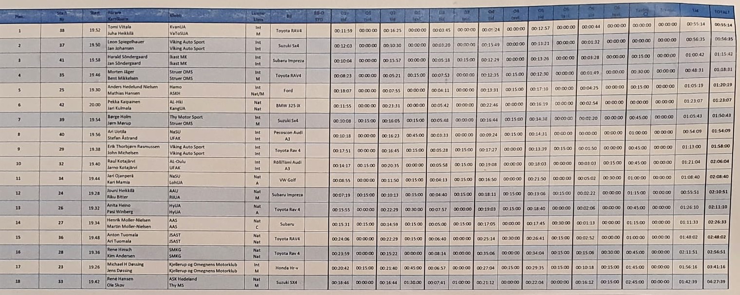 Ja Beginner's cup 1. Palinkas - Johansson 2:11:47 60 2. Kotajärvi - Kotajärvi 3:21:26 58 2022-10-29 @11:00 (EET) päivitys 11:15 (EET) Ruotsin perjantaikisan tuloksetMelkoinen hässäkkä oli perjantai-illan kapina Falköpingissä. Vettä on tullut taivaantäydeltä pari viikkoa ja kisajärjestäjät ovat parhaansa mukaan muuttaneet reittiä sitä mukaa kun uraa on mennyt käyttökelvottomaksi. Valitettavasti viime hetken muutokset ja muut ongelmat näkyivät myös kisapapereissa, kartat olivat pääosin melkoisen suttuisia ja sisälsivät joitakin erikoisia virheitä. Käytössä oli myös varsin eksoottisia mittakaavoja, kuten esimerkiksi 1:3.500 ja 1:87.800.Yhtä kaikki, parhaat tiesivät kyllä, mitä tehdä. Viitala-Heikkilä nappasi maksimipisteet ulkomaalaisten luokassa ja muut suomalaiset "luovuttivat" maajoukkue-edun tanskalaisille: tanskalaiset johtavat nyt kuudella pisteellä. Ruotsalaisten luokassa hieman yllättäen ykköpaikalle itsensä kampesi Cedstedt-Holmborn, mikä kasvatti Uffen paineita lauantain kilpailuun. NEZ-sarjassa kolmen kärki on nyt Viitala-Heikkilä, Söndergaard-Söndergaard ja Henriksson-Andersson. Viimeksi mainittu voi kasvattaa pistepottiaan enää kolmella pisteellä, joten mestaruus on kahden kauppa: Söndergaardit pudottavat voitolla Viitala-Heikkilän kakkoseksi. Hopeamitalille näyttäisi olevan ainakin teoreettisia mahdollisuuksia myös Jäger-Mikkelsenillä. Mahdollista on, että ruotsalaiset jäävät sarjassa ilman mitalia. Jännimmät paikat ovat kyllä maajoukkuekullan ratkaisussa, vaikka tanskalaiset nyt kuudella pisteellä jotavat, on vielä mahdollista (joskun hyvin epätodennäköistä), että meikäläiset nappaavat seitsemän pistettä enemmän maajoukkueelle. Ohessa kuvat järjestäjän tulosluetteloista kisan päättyessä (kiitokset JH).